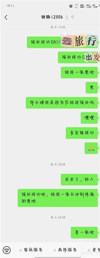 “你不理我是因?yàn)樵诮o我候補(bǔ)嗎”“親愛(ài)的我要票”……另一名網(wǎng)友也發(fā)帖稱,自己使用向12306微信公眾號(hào)“發(fā)瘋”的辦法,成功候補(bǔ)到了車票,其發(fā)布的網(wǎng)帖題為“適當(dāng)發(fā)瘋候補(bǔ)成功”。