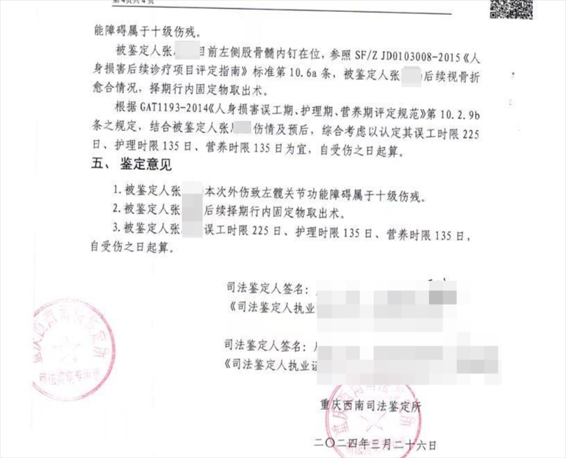 張同學介紹,第一次開庭主要是確定鑒定機構。張同學提供的司法鑒定書顯示,2024年3月26日,重慶西南司法鑒定所鑒定認為,她本次外傷致左髖關節(jié)功能十級傷殘。其左側股骨髓內釘在位,后續(xù)視骨折愈合情況,擇期行內固定物取出術。