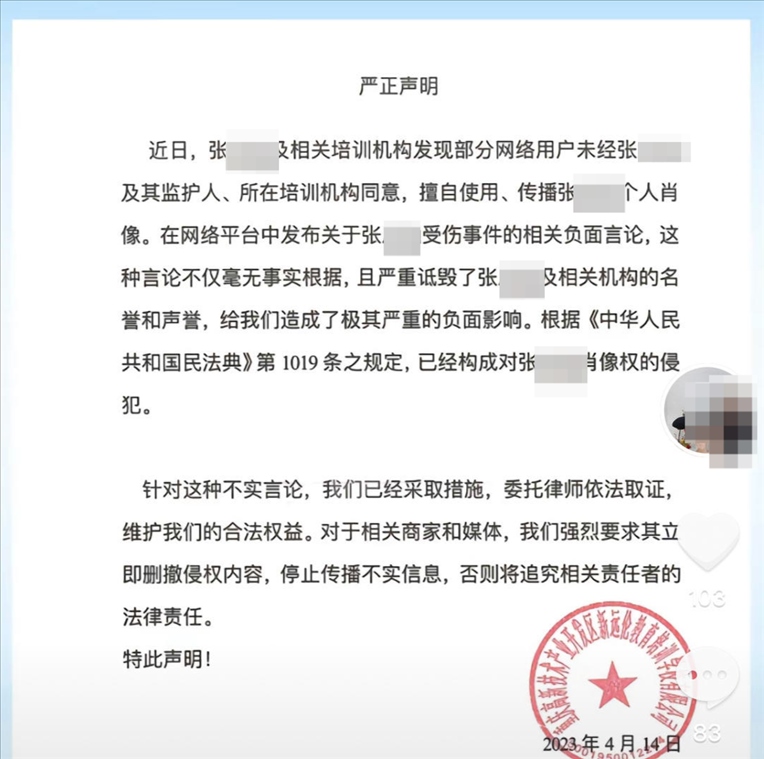 紅星新聞注意到,遠倫舞蹈帳號2023年2023年4月曾發(fā)布一則聲明。落款為重慶高新技術產業(yè)開發(fā)區(qū)新遠倫教育培訓學校有限公司(下稱遠倫培訓學校)。聲明稱,近日,張某涵及相關培訓機構發(fā)現部分網絡用戶未經張某涵及其監(jiān)護人、所在培訓機構同意,擅自使用、傳播張某涵個人肖像。在網絡平臺中發(fā)布關于受傷事件的相關負面言論,這種言論不僅毫無事實根據,且嚴重詆毀了張某涵及相關機構的名譽和聲譽,給公司造成了極其嚴重的負面影響,已經構成對張某涵肖像權的侵犯。
