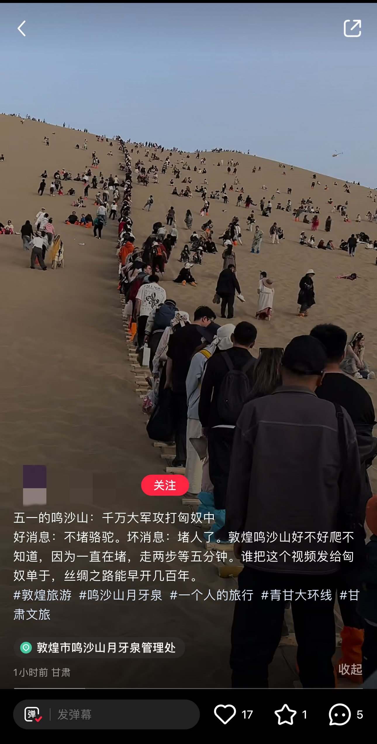還有甘肅的網友在發(fā)布的關于敦煌鳴沙山的筆記中稱:“好消息:不堵駱駝。壞消息:堵人了……走兩步路等五分鐘?!?/p>