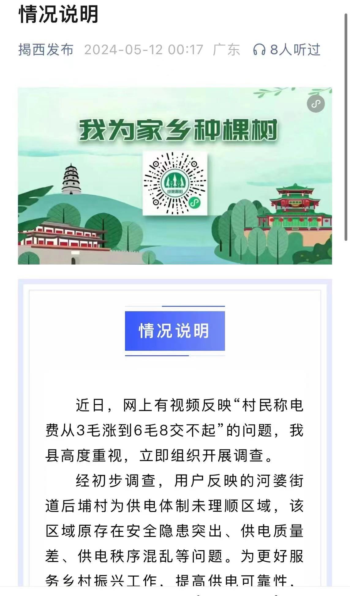 針對(duì)此事,“揭西發(fā)布”微信公眾號(hào)于5月12日發(fā)布了情況說(shuō)明,表示對(duì)網(wǎng)上反映的“村民稱電費(fèi)從3毛漲到6毛8交不起”的問題高度重視,并已立即開展調(diào)查。