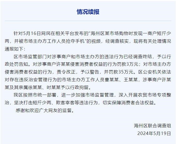 央視網(wǎng)消息:據(jù)“今日海州”微信公眾號消息,針對5月16日網(wǎng)民在相關(guān)平臺發(fā)布的“海州區(qū)某市場購物時發(fā)現(xiàn)一商戶短斤少兩,并被市場主辦方工作人員搶奪手機(jī)”的視頻,經(jīng)調(diào)查核實(shí),現(xiàn)將有關(guān)處理情況通報如下:區(qū)市場監(jiān)管部門對涉事商戶和市場主辦方的違法行為已經(jīng)調(diào)查終結(jié),予以行政處罰告知。對涉事商戶許某某侵害消費(fèi)者權(quán)益的行為罰款3萬元;對市場主辦方侵害消費(fèi)者權(quán)益的行為,責(zé)令改正,予以警告,并罰款35萬元。區(qū)公安機(jī)關(guān)依法對存在違反治安管理行為的市場主辦方工作人員曹某某、王某某,涉事商戶許某某及其親屬徐某某、時某某予以行政拘留。