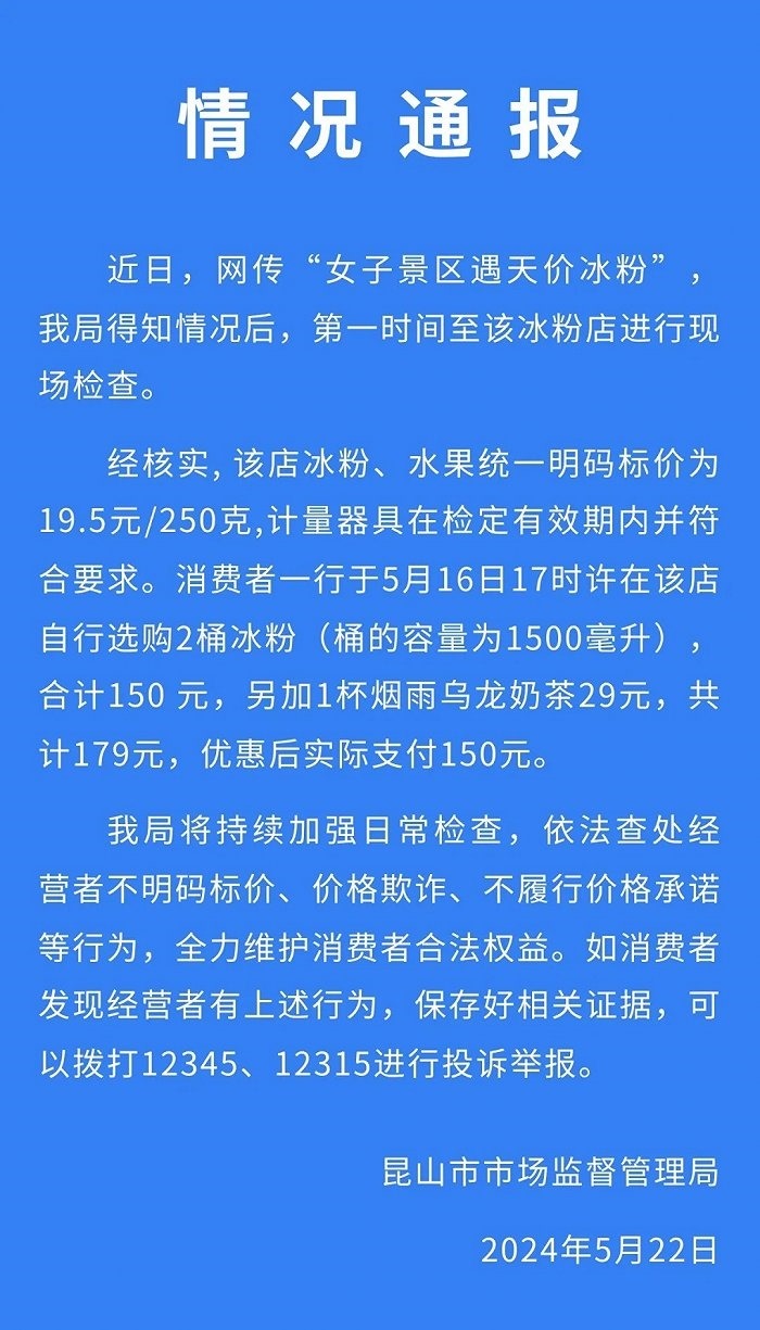 央視網(wǎng)消息:5月22日,江蘇昆山市市場(chǎng)監(jiān)督管理局發(fā)布情況通報(bào):近日,網(wǎng)傳“女子景區(qū)遇天價(jià)冰粉”,我局得知情況后,第一時(shí)間至該冰粉店進(jìn)行現(xiàn)場(chǎng)檢查。經(jīng)核實(shí),該店冰粉、水果統(tǒng)一明碼標(biāo)價(jià)為19.5元/250克,計(jì)量器具在檢定有效期內(nèi)并符合要求。消費(fèi)者一行于5月16日17時(shí)許在該店自行選購(gòu)2桶冰粉(桶的容量為1500毫升),合計(jì)150元,另加1杯煙雨烏龍奶茶29元,共計(jì)179元,優(yōu)惠后實(shí)際支付150元。