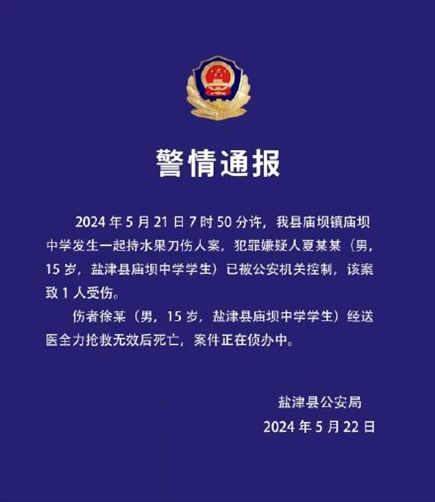·云南鹽津公安通報一中學(xué)發(fā)生持水果刀傷人案:嫌疑人已被控制,一人搶救無效死亡。