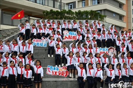 四川省內(nèi)江市東興區(qū)牛牦山小學(xué),新入隊的少先隊員們一起分享獲得紅領(lǐng)巾的喜悅。