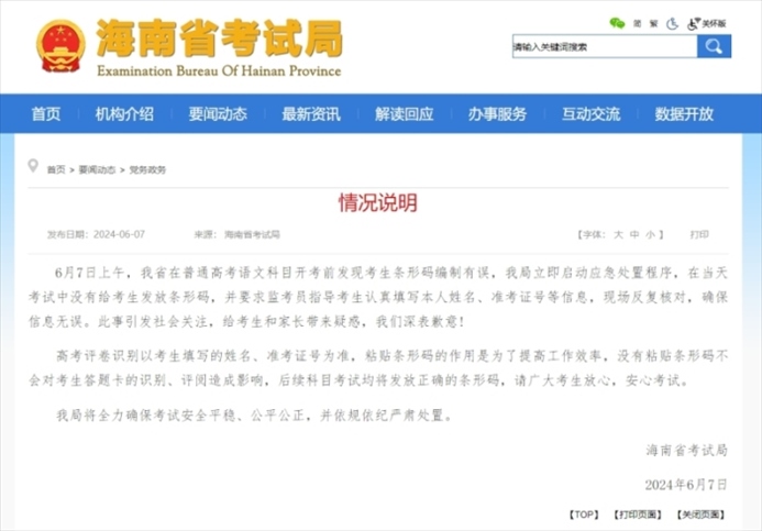 ·海南通報“高考語文卷未發(fā)條形碼”:不影響答題卡識別、評閱。