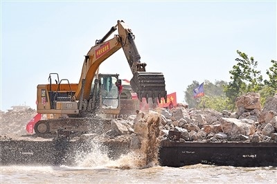 在湖南省岳陽市華容縣團(tuán)洲垸洞庭湖大堤決口現(xiàn)場,搶險隊伍在進(jìn)行堵口作業(yè)。新華社記者 陳振海攝