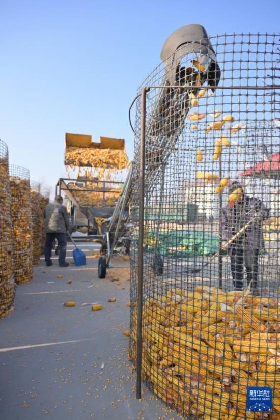 11月13日,在黑龍江省肇東市一處秋糧晾曬場,海城雙麗現(xiàn)代農(nóng)機(jī)專業(yè)合作社的農(nóng)民在堆放玉米。