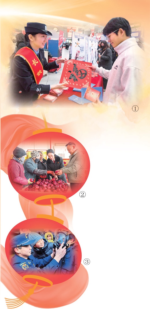 圖①:在吉林長春,鐵路公安民警為旅客送“?!弊帧?/p>