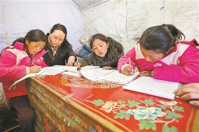 西藏自治區(qū)日喀則市薩迦縣普村的安置點(diǎn)內(nèi),黨員次央(左二)在輔導(dǎo)村里的小朋友寫(xiě)作業(yè)。
