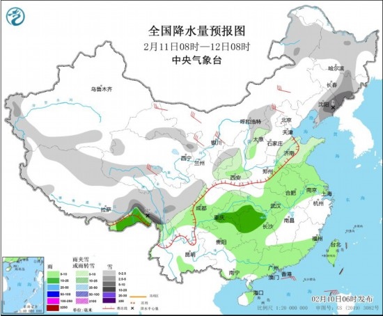 全國降水量預(yù)報圖(2月10日08時-11日08時) 圖片來源:中央氣象臺網(wǎng)站