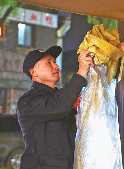 一場小雨后,執(zhí)法隊(duì)員幫助沿街店鋪撤收擋雨棚。