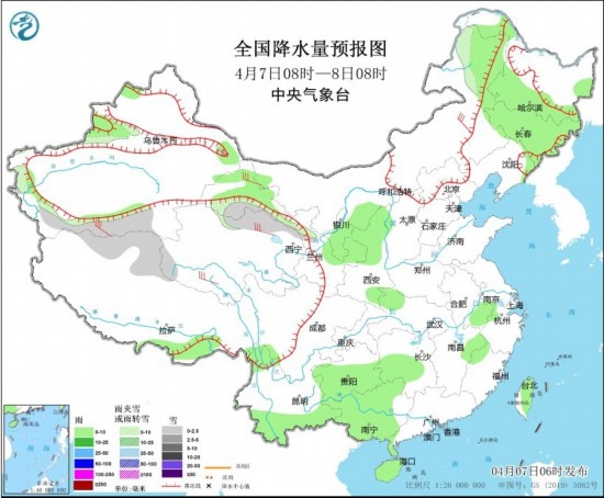 4月7日08時至8日08時,新疆南疆西部和南部山區(qū)、內(nèi)蒙古東北部、黑龍江中北部、西藏西北部、青海北部等地部分地區(qū)有小雪或雨夾雪。新疆伊犁河谷、寧夏、陜西北部、黑龍江南部、吉林、云南南部、貴州中南部、廣西大部、湖南中西部、安徽南部、海南島、臺灣島等地部分地區(qū)有小雨,局地有中雨。內(nèi)蒙古大部、西藏北部、甘肅河西、川西高原北部等地部分地區(qū)有4~6級風(fēng),陣風(fēng)7級。