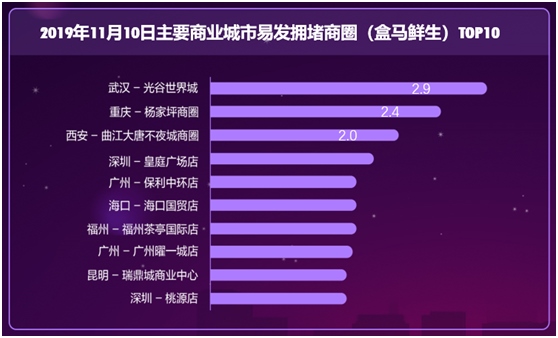 數(shù)據(jù)顯示,11月10日,盒馬鮮生所在區(qū)域易發(fā)生擁堵商圈排名前十位的依次是,武漢光谷世界城、重慶楊家坪、西安曲江大唐不夜城、深圳皇庭廣場店、廣州保利中環(huán)、??趪Q(mào)、福州茶亭國際、廣州曜一城、昆明瑞鼎城和深圳桃源。