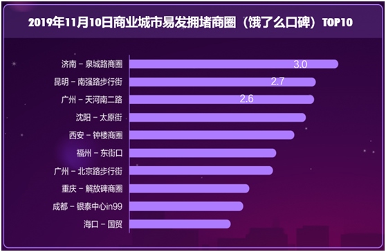 口碑餓了么線下商戶所在區(qū)域易發(fā)生擁堵商圈排名前十位的依次是,濟南泉城路、昆明南強步行街、廣州天河南二路、沈陽太原街、西安鐘樓、福州東街口、廣州北京路步行街、重慶解放碑、成都銀泰中心in99和海口國貿(mào)。