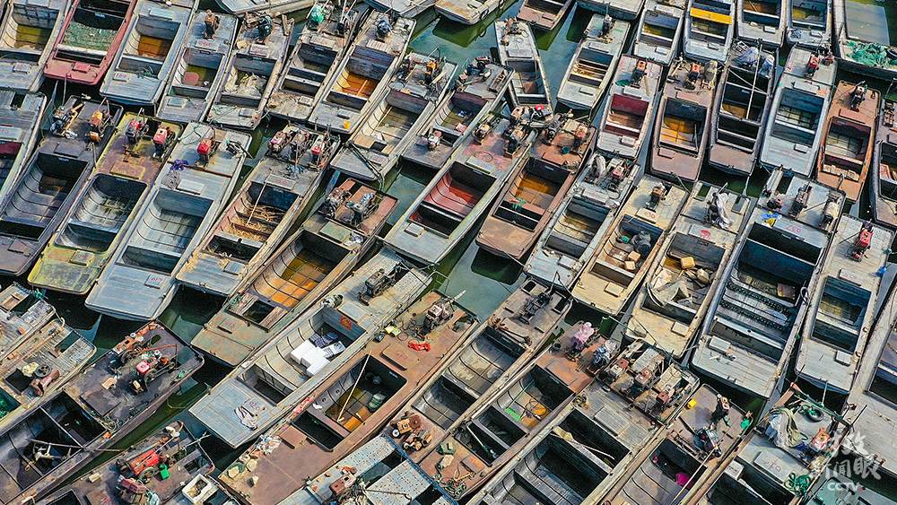 △國家實(shí)施長江流域禁捕退捕政策后,江蘇宿遷泗洪縣啟動洪澤湖水域禁捕退捕和住家船整治工作。這是聚集在漁港等待拆解的漁船。