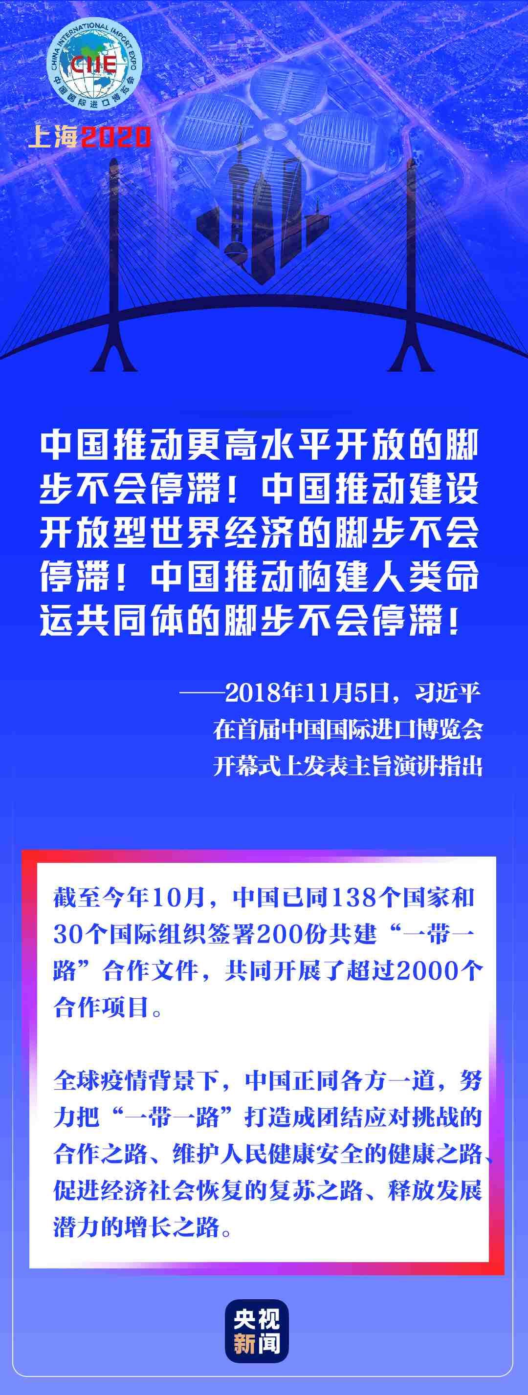 在新冠肺炎疫情全球蔓延、世界經(jīng)濟(jì)持續(xù)低迷的非常時(shí)期,進(jìn)博會(huì)如期而至,為世界各國(guó)各地區(qū)搭建通往更多市場(chǎng)機(jī)遇、投資機(jī)遇、增長(zhǎng)機(jī)遇的橋梁。