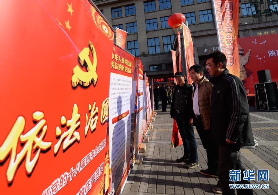 西安市民在國家憲法日宣傳活動現(xiàn)場觀看依法治國宣傳展板(2014年12月4日攝)。新華社記者李一博攝