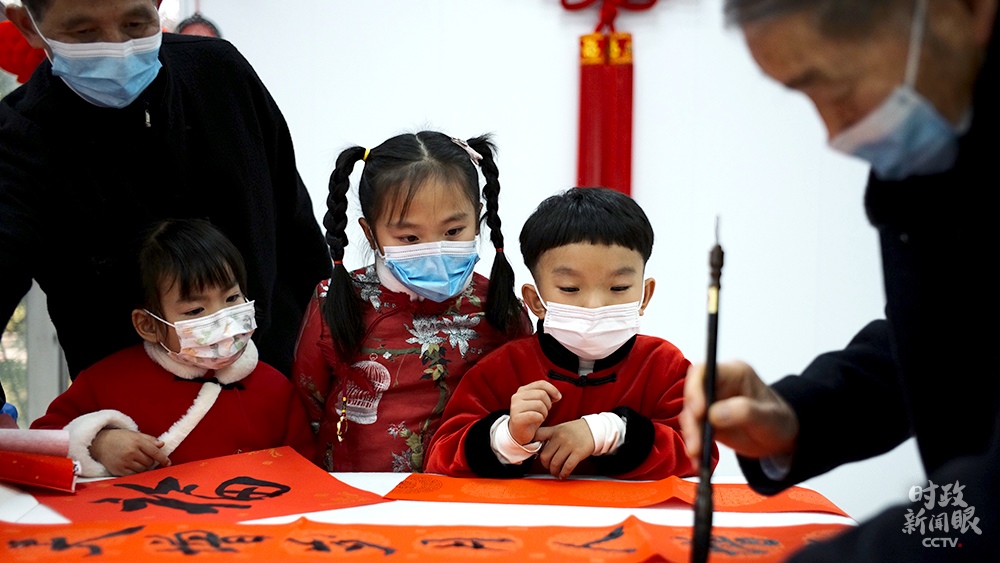△金元社區(qū)居民活動(dòng)室內(nèi),孩子們觀(guān)摩書(shū)法寫(xiě)作。(總臺(tái)央視記者王哈男拍攝)