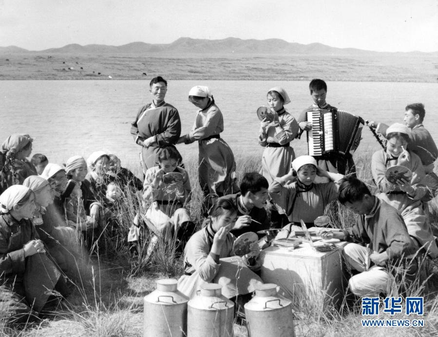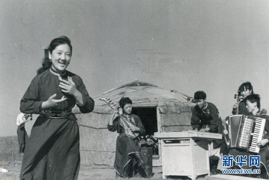 20世紀六七十年代,內(nèi)蒙古自治區(qū)錫林郭勒盟蘇尼特右旗烏蘭牧騎隊員在草原上為周邊牧民表演節(jié)目(資料照片)。新華社發(fā)