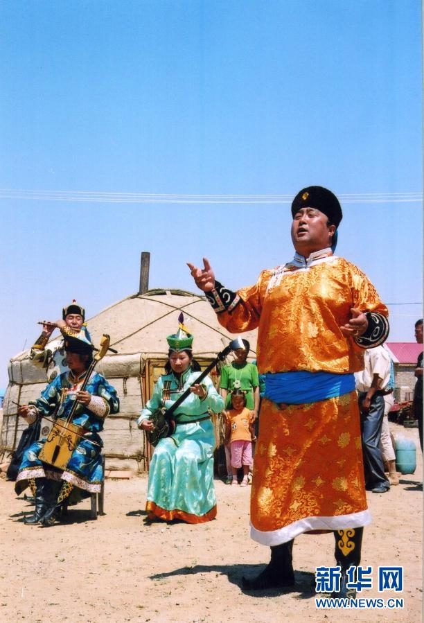 錫林郭勒盟烏蘭牧騎隊員在草原上為牧民演出(資料照片)。新華社發(fā)