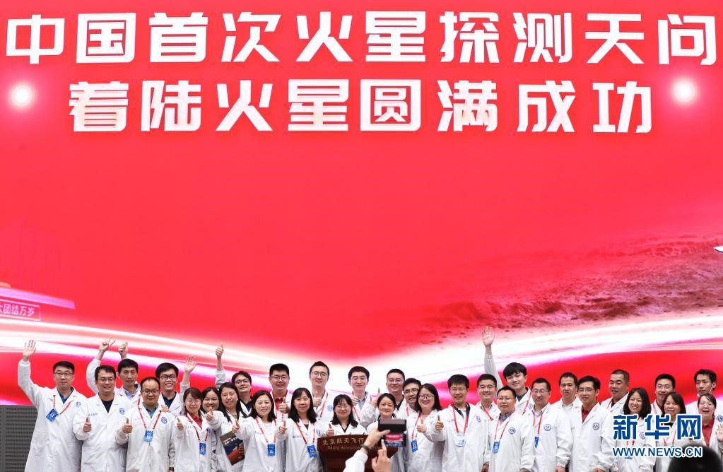 5月15日,航天科研人員在北京航天飛行控制中心指揮大廳慶祝我國首次火星探測任務(wù)著陸火星成功。新華社記者 金立旺 攝