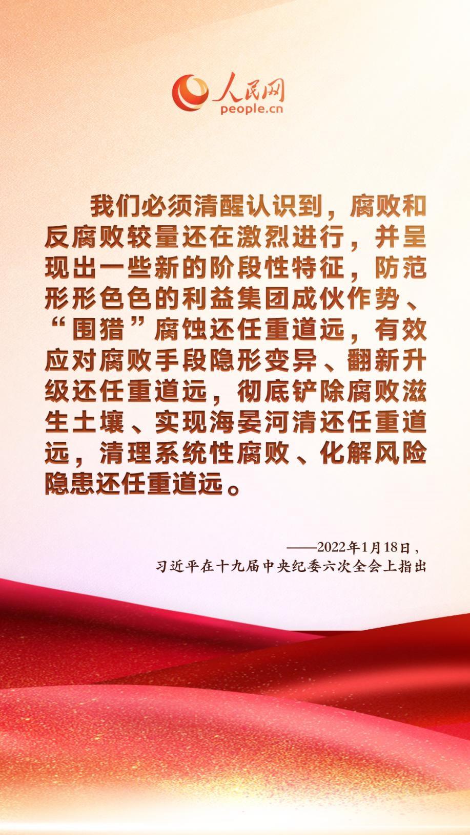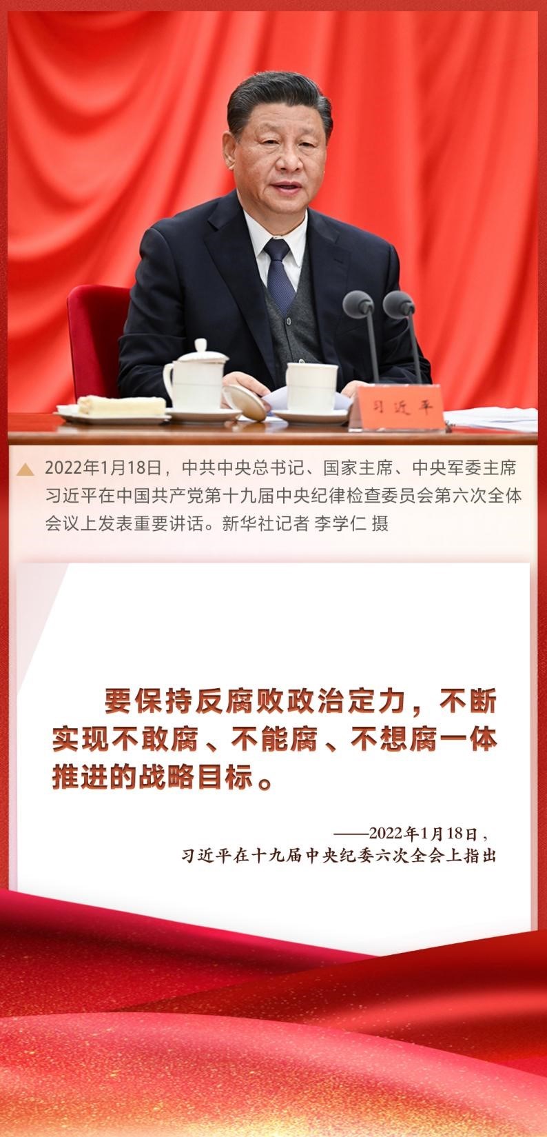 “要保持反腐敗政治定力,不斷實現(xiàn)不敢腐、不能腐、不想腐一體推進(jìn)的戰(zhàn)略目標(biāo)?!敝泄仓醒肟倳?、國家主席、中央軍委主席習(xí)近平在十九屆中央紀(jì)委六次全會上發(fā)表重要講話,深刻總結(jié)新時代黨的自我革命的成功實踐,深刻闡述全面從嚴(yán)治黨取得的歷史性、開創(chuàng)性成就,產(chǎn)生的全方位、深層次影響,對堅持不懈把全面從嚴(yán)治黨向縱深推進(jìn)、迎接黨的二十大勝利召開作出戰(zhàn)略部署。