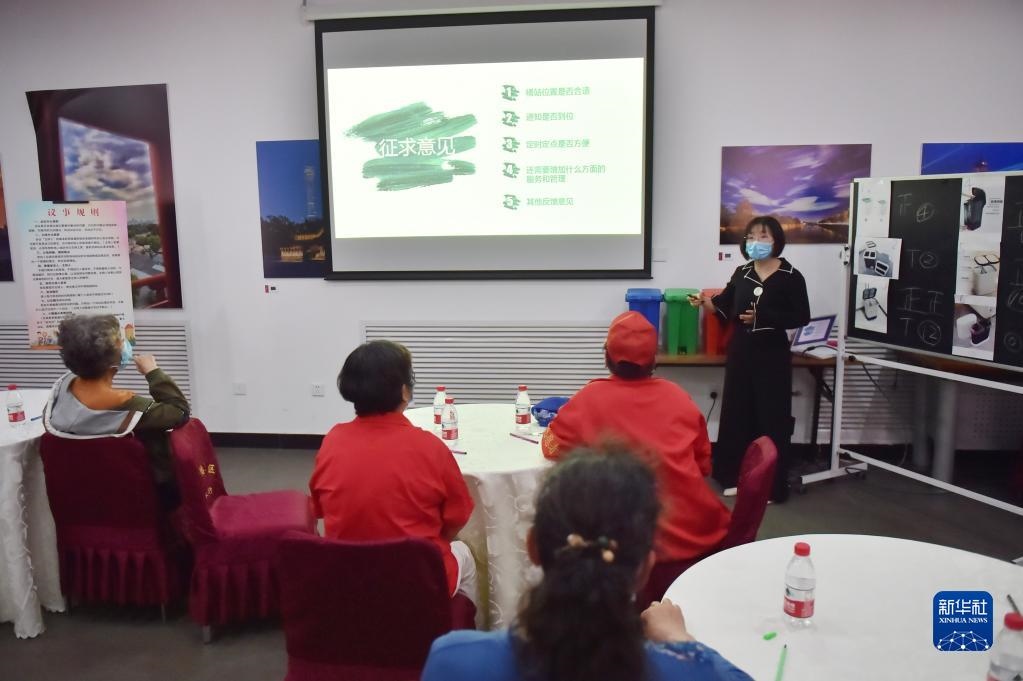 在北京建國門街道趙家樓社區(qū)議事廳舉行的“兩桶一袋”居民征求意見懇談會上,來自社區(qū)的12位垃圾分類達(dá)人對“兩桶”款式進(jìn)行投票選擇,同時,街道針對桶站位置、定時定點(diǎn)投放等垃圾分類運(yùn)營管理聽取居民意見(2020年5月2日攝)。新華社記者彭子洋攝