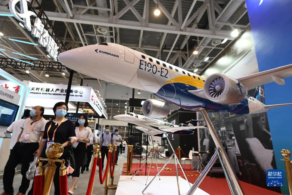 參觀者從2021金磚國(guó)家新工業(yè)革命展展出的飛機(jī)模型前走過(guò)(2021年9月8日攝)。新華社記者林善傳攝