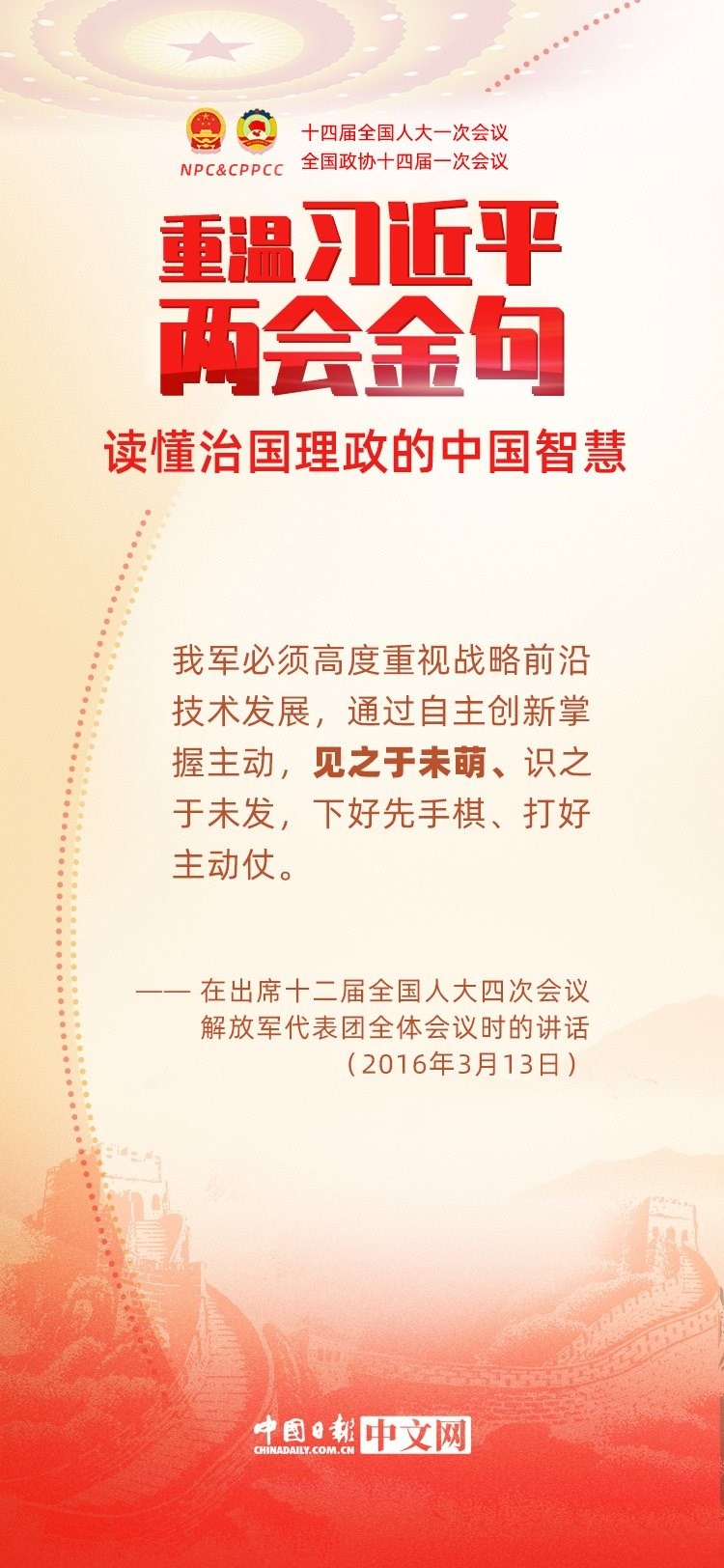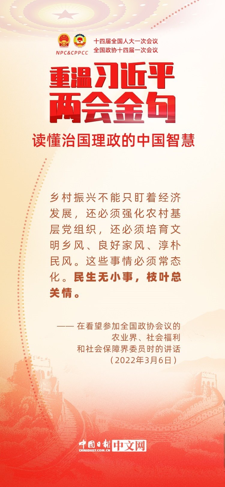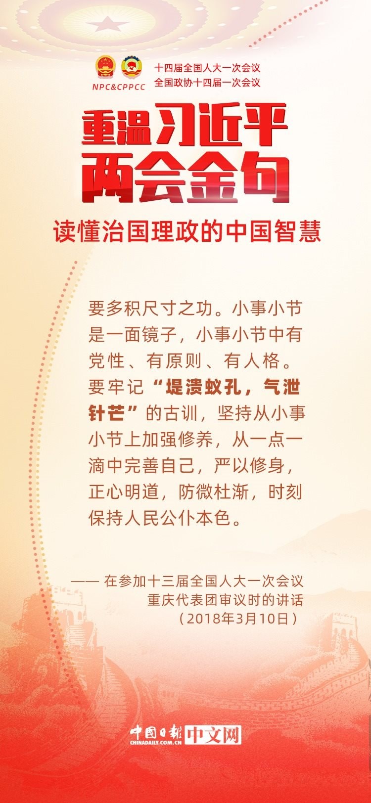 黨的十八大以來(lái),每年兩會(huì)期間,習(xí)近平總書(shū)記都要與代表委員共商國(guó)是。十年來(lái),在一系列重要論述中,習(xí)近平總書(shū)記使用詩(shī)詞、古語(yǔ)等典故,把中華優(yōu)秀傳統(tǒng)文化融入治國(guó)理政的理論和實(shí)踐中。