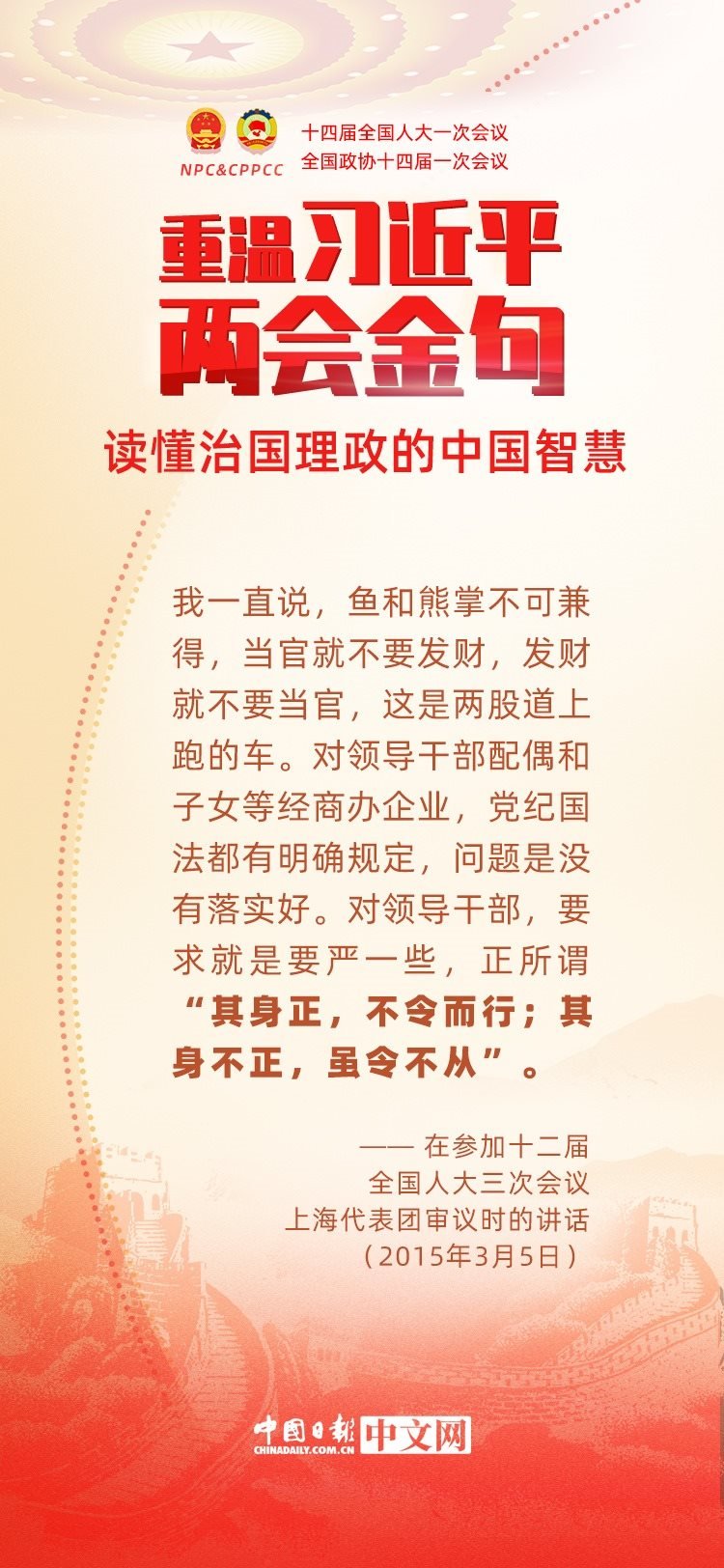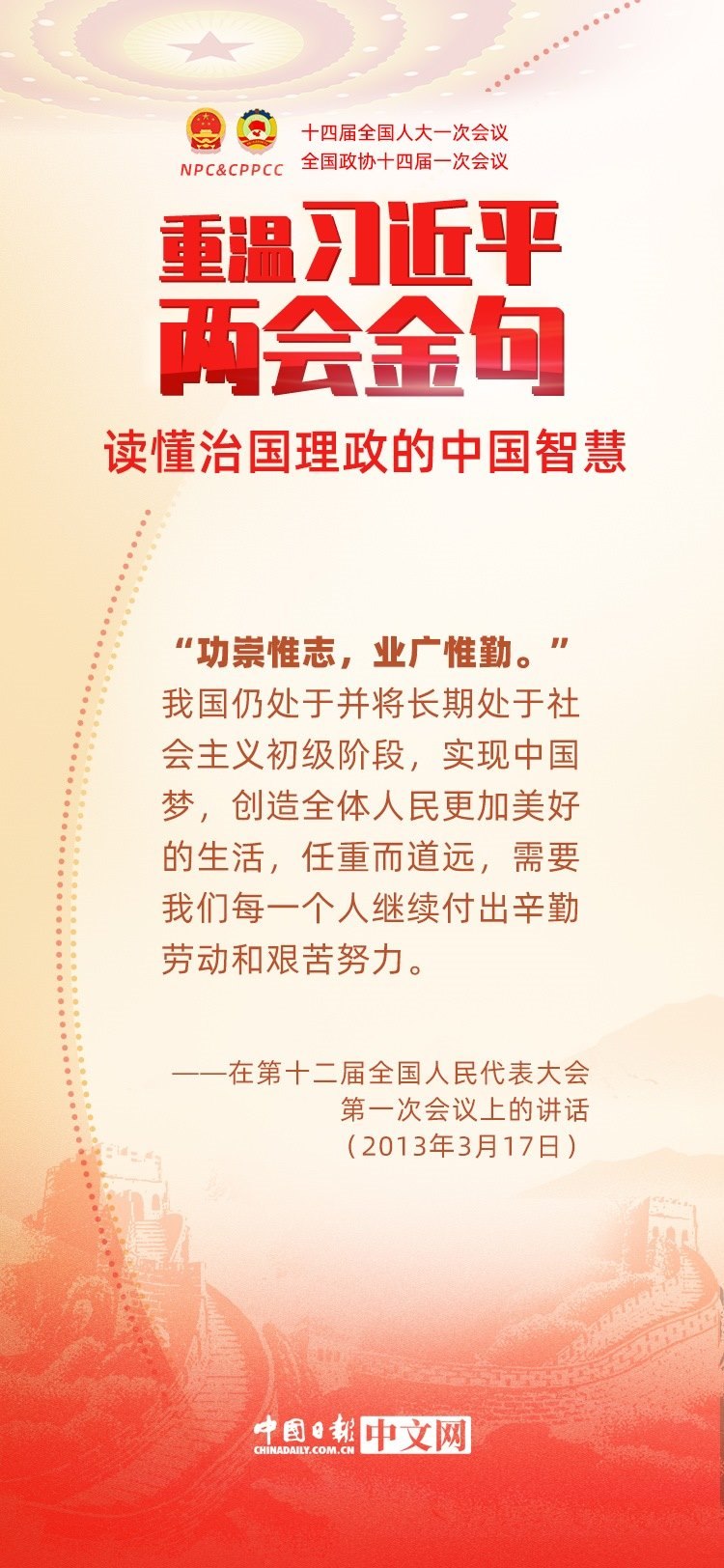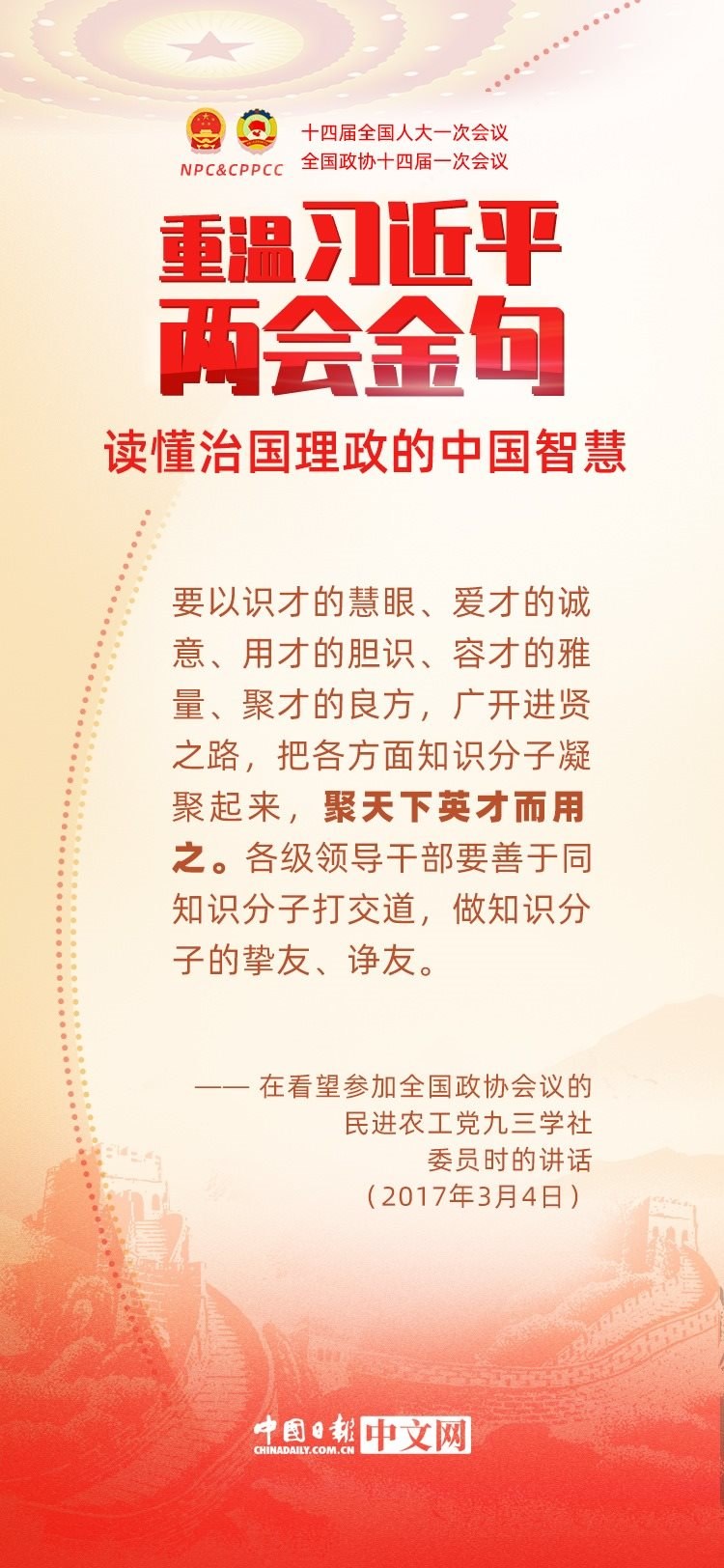 黨的十八大以來(lái),每年兩會(huì)期間,習(xí)近平總書(shū)記都要與代表委員共商國(guó)是。十年來(lái),在一系列重要論述中,習(xí)近平總書(shū)記使用詩(shī)詞、古語(yǔ)等典故,把中華優(yōu)秀傳統(tǒng)文化融入治國(guó)理政的理論和實(shí)踐中。