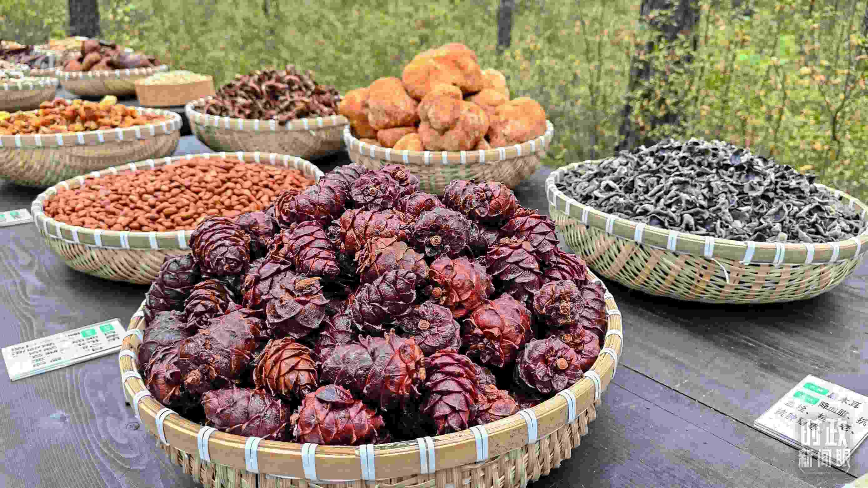 △漠河林場(chǎng)自然林區(qū)的林下作物展示,最靠近鏡頭的是偃松塔。(總臺(tái)央視記者楊立峰拍攝)