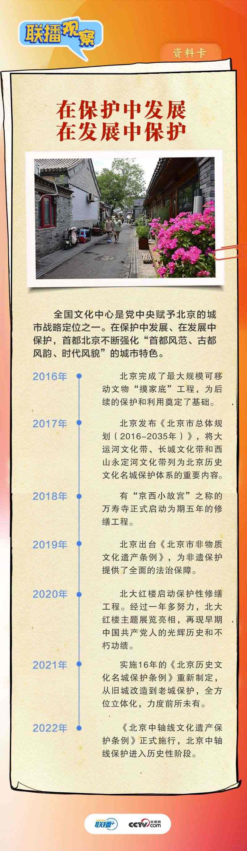 黨的十八大以來,習(xí)近平總書記高度關(guān)心北京歷史文化保護(hù),多次踏訪北京老胡同、四合院、博物館等地。他強調(diào),北京是世界著名古都,豐富的歷史文化遺產(chǎn)是一張金名片,傳承保護(hù)好這份寶貴的歷史文化遺產(chǎn)是首都的職責(zé)。