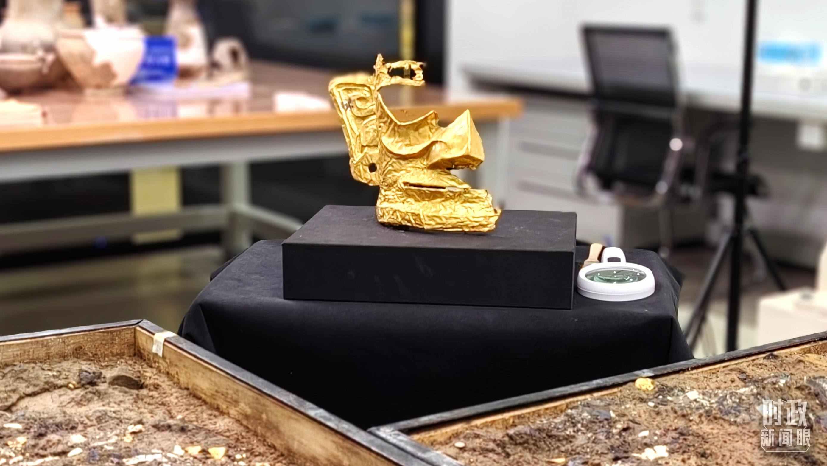 △文物保護(hù)修復(fù)展示中心內(nèi)正在修復(fù)的金面具。(總臺(tái)央視記者王萌萌拍攝)