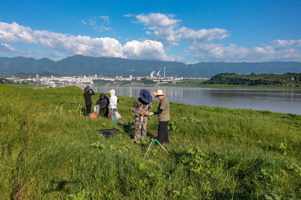 在位于重慶的中國科學(xué)院三峽庫區(qū)水土保持與環(huán)境研究站,中國科學(xué)院成都山地所科研人員在庫區(qū)消落帶上開展相關(guān)監(jiān)測(2023年7月5日攝,無人機(jī)照片)。新華社記者 黃偉 攝