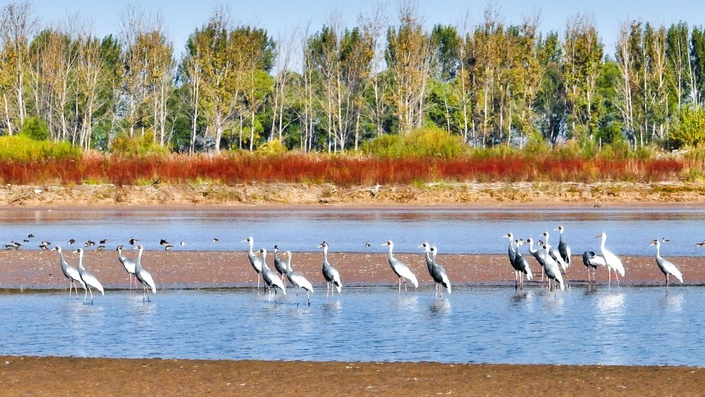 在山東黃河三角洲國家級自然保護(hù)區(qū)拍攝的白枕鶴(2022年10月18日攝)。新華社發(fā)(楊斌 攝)