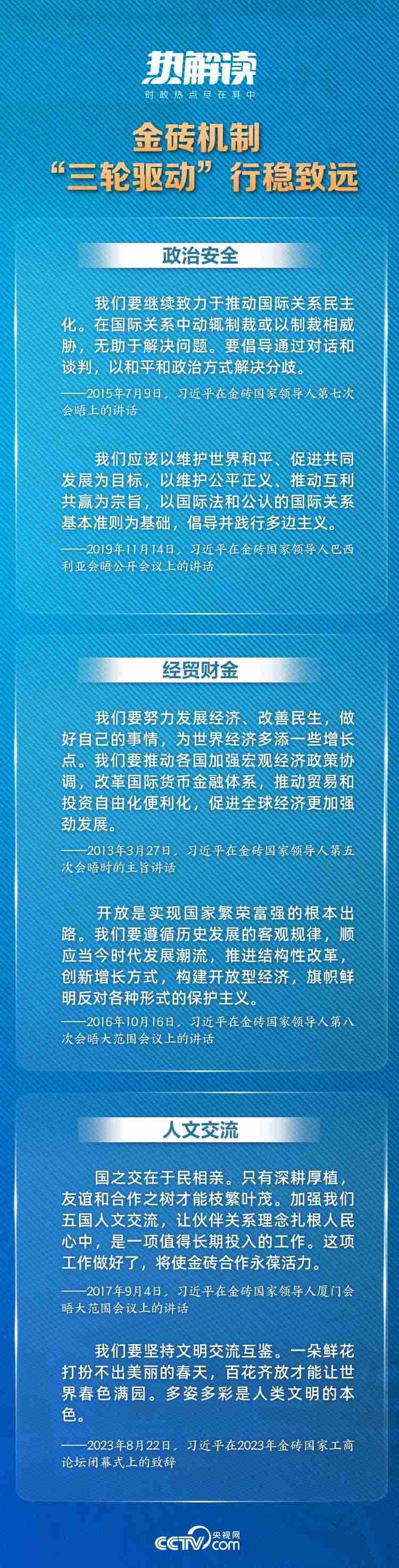 多年來,習(xí)主席一次次為完善金磚國家“三輪驅(qū)動”合作架構(gòu)架梁立柱,為解決全球性挑戰(zhàn)提供中國方案,為推動全球公平公正發(fā)展貢獻(xiàn)中國智慧,在金磚發(fā)展之路上留下濃墨重彩的中國印記。