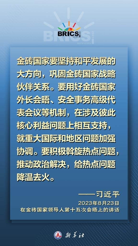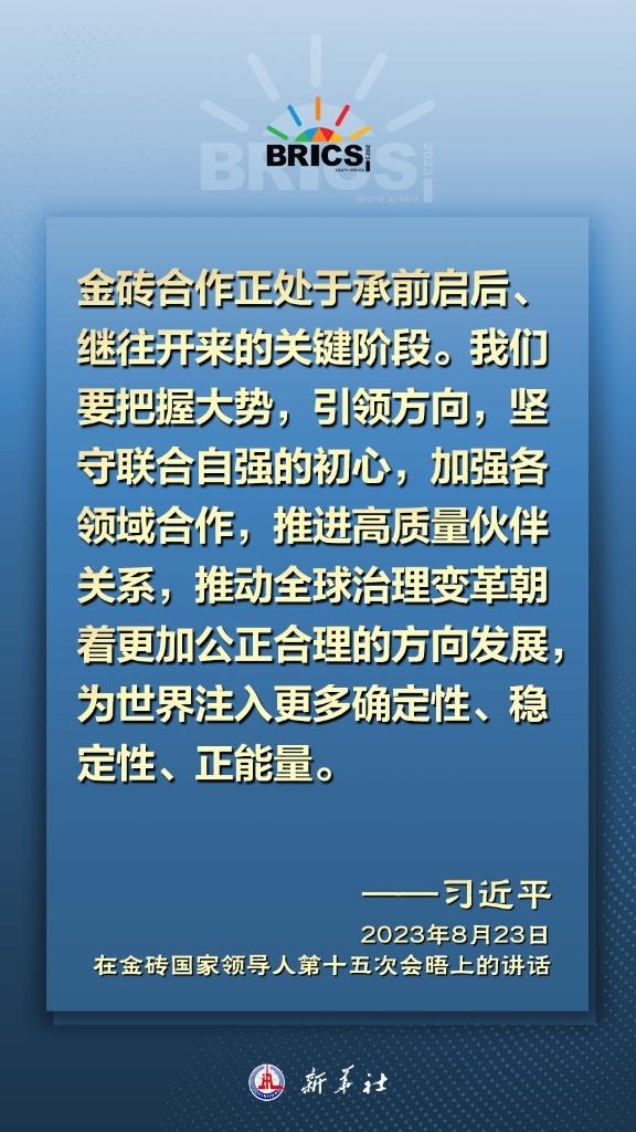 國家主席習近平23日在南非約翰內(nèi)斯堡舉行的金磚國家領(lǐng)導(dǎo)人第十五次會晤上發(fā)表講話指出,金磚合作正處于承前啟后、繼往開來的關(guān)鍵階段。我們要把握大勢,引領(lǐng)方向,堅守聯(lián)合自強的初心,加強各領(lǐng)域合作,推進高質(zhì)量伙伴關(guān)系,推動全球治理變革朝著更加公正合理的方向發(fā)展,為世界注入更多確定性、穩(wěn)定性、正能量。