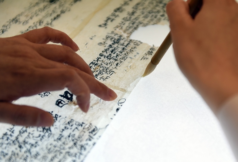 2022年5月17日,在安徽博物院文物科技保護(hù)中心紙質(zhì)文物修復(fù)室,工作人員對古籍文物進(jìn)行補(bǔ)全。