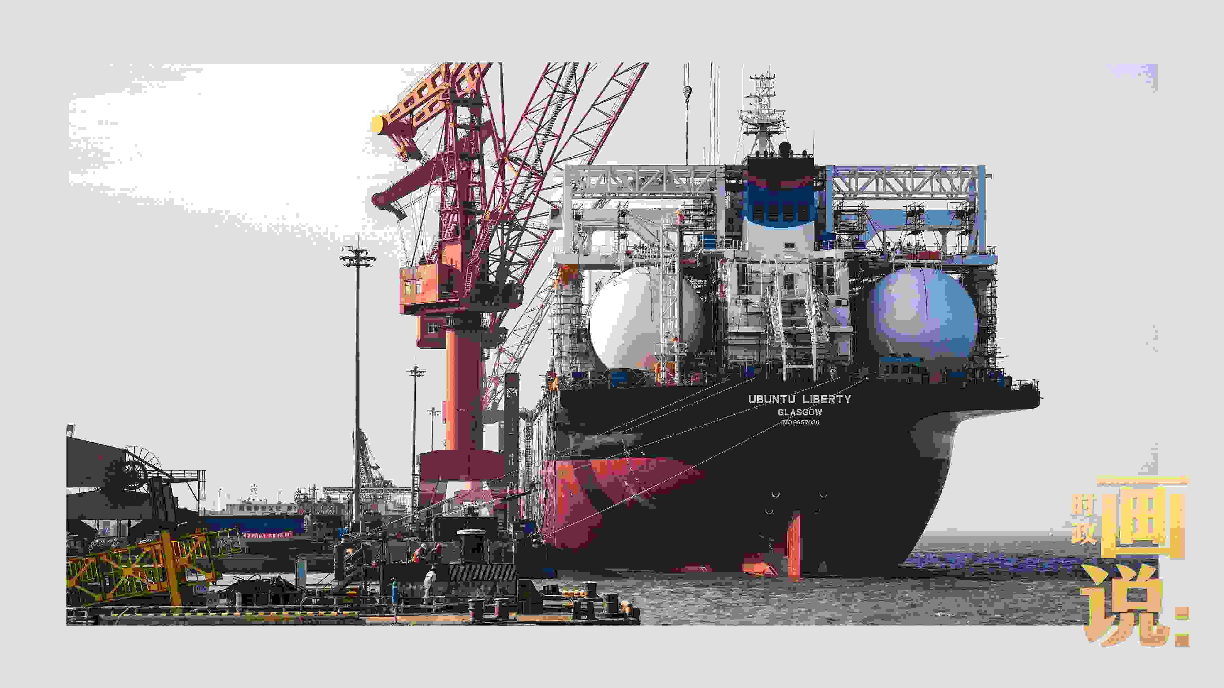 △外高橋船塢碼頭旁,一艘建造中的巨型雙燃料散貨船停靠在泊位。浦東新區(qū),上海