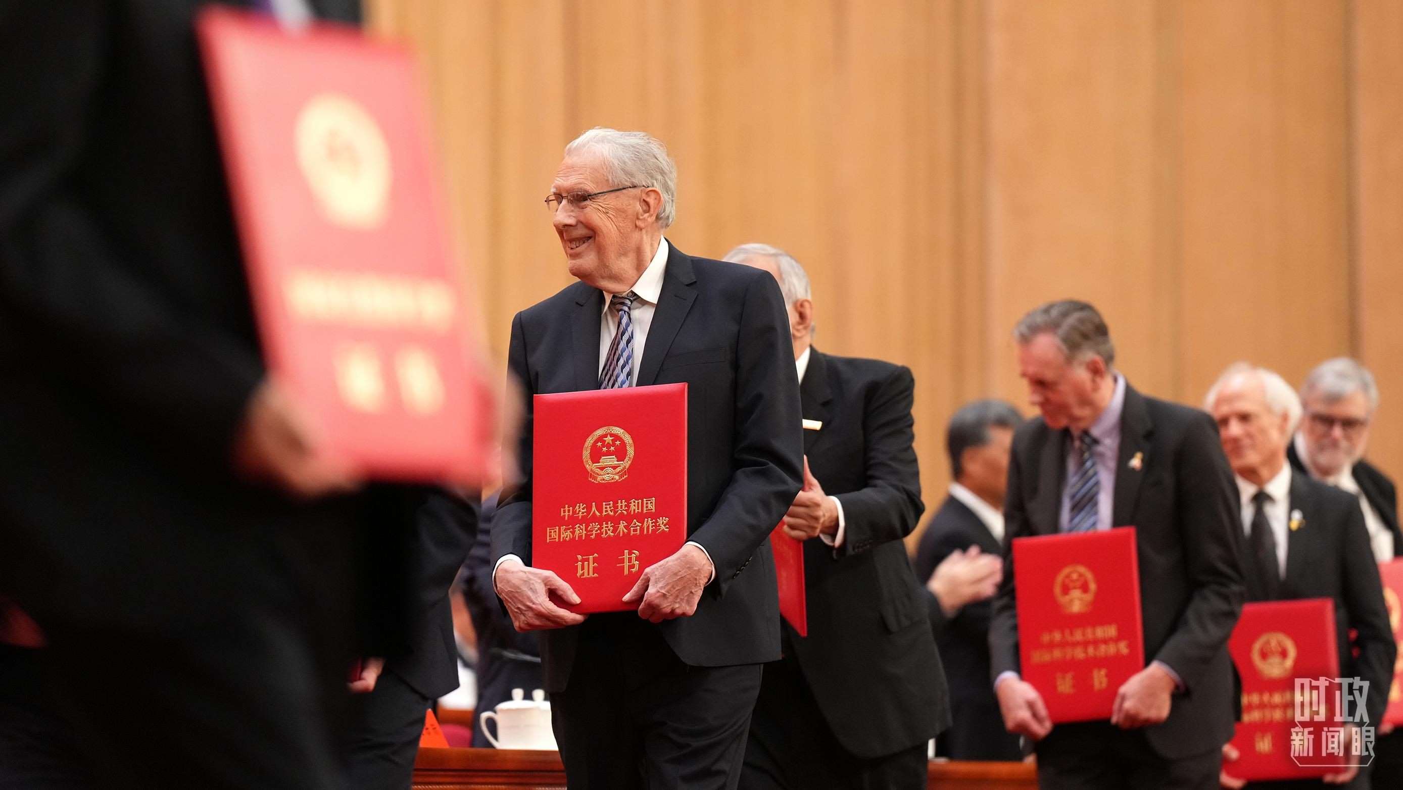 △獲獎(jiǎng)的外籍科技工作者,獎(jiǎng)?wù)碌谋趁婵逃蝎@獎(jiǎng)?wù)咝彰?。(總臺(tái)國廣記者李晉、央視記者姚瑤拍攝)