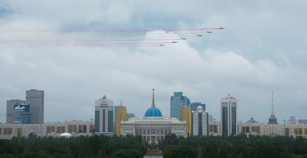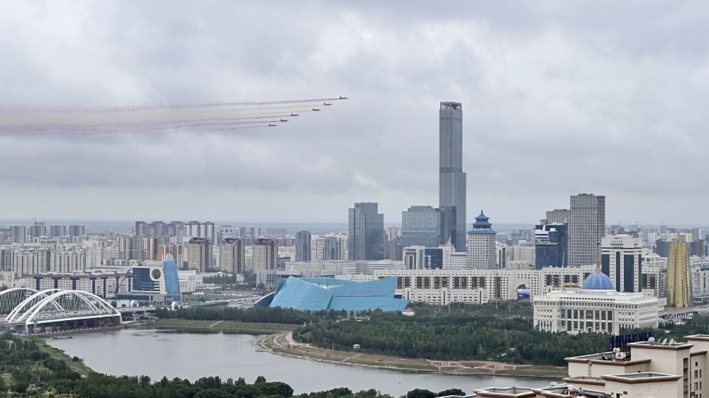 習(xí)近平主席抵達(dá)時(shí),哈方多架戰(zhàn)機(jī)在總統(tǒng)府上空拉出中國國旗色彩煙歡迎中國貴賓。
