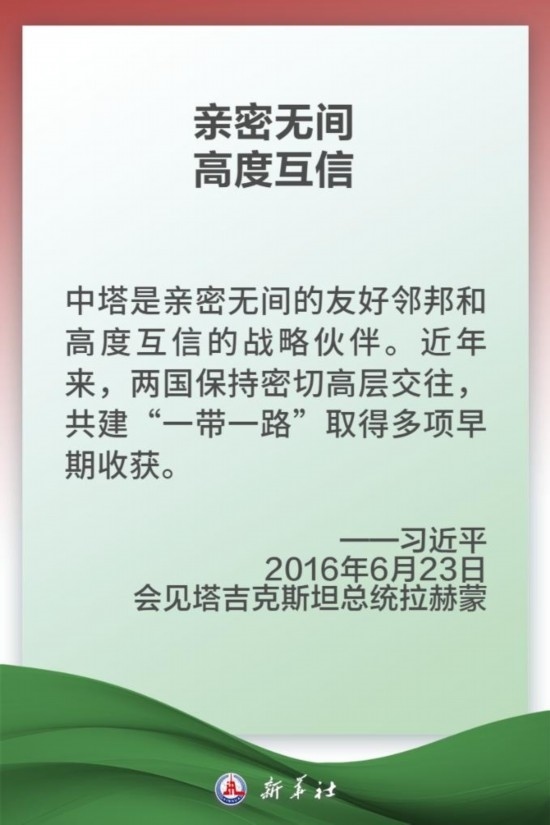 中國和塔吉克斯坦山水相連,兩國人民友好交往源遠流長。中塔建交30年多來,兩國關(guān)系取得跨越式發(fā)展,達到全面戰(zhàn)略伙伴關(guān)系的歷史性高度。塔方最早同中方簽署共建“一帶一路”合作倡議,雙方率先建立發(fā)展共同體和安全共同體。