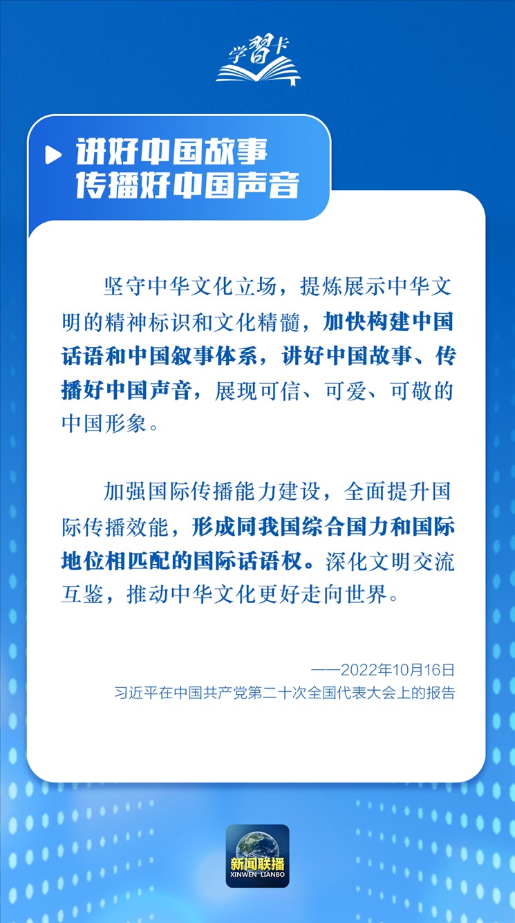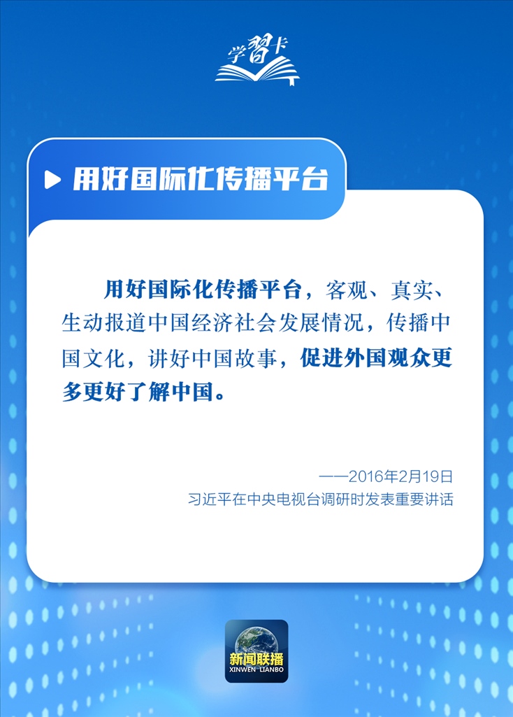 習(xí)近平總書記高度重視國(guó)際傳播能力建設(shè),指出當(dāng)前外宣工作處于歷史最好時(shí)期,同時(shí)也面臨最大壓力,強(qiáng)調(diào)要全面加強(qiáng)和改進(jìn)國(guó)際傳播工作,深化文明交流互鑒,形成同我國(guó)綜合國(guó)力和國(guó)際地位相匹配的國(guó)際話語權(quán),增強(qiáng)中華文明傳播力影響力。一起學(xué)習(xí)↓