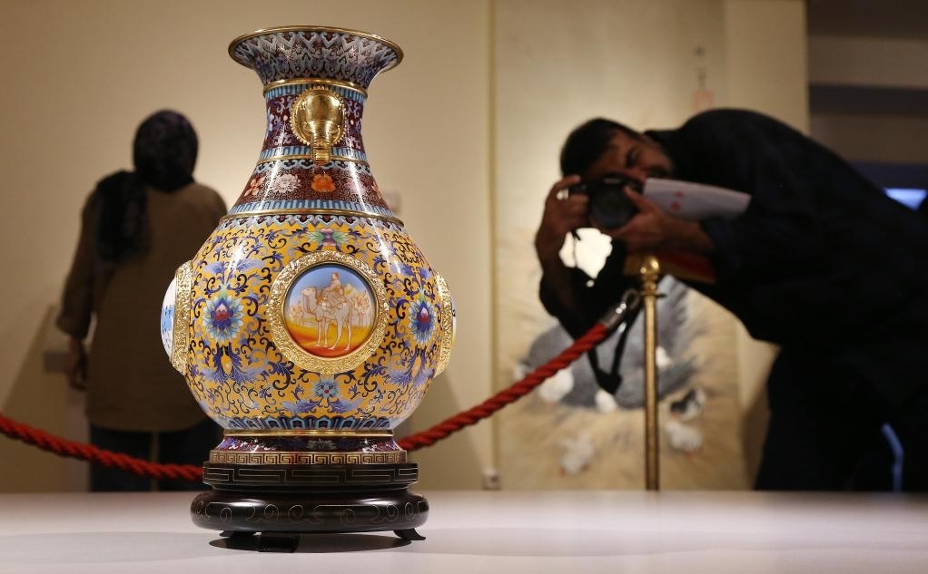 2024年10月12日,在伊朗首都德黑蘭的馬利克國家博物館,觀眾在“絲路長(zhǎng)云——中國藝術(shù)文化精品展”現(xiàn)場(chǎng)拍攝展品。新華社記者 沙達(dá)提 攝