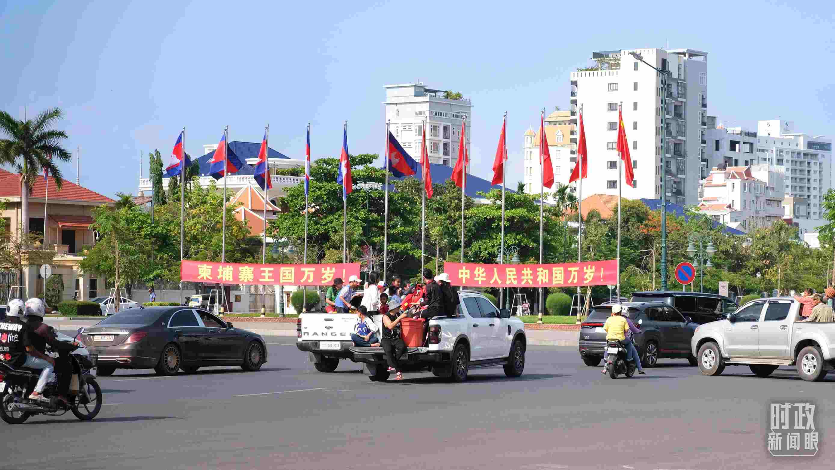 △金邊街頭的兩國國旗和標(biāo)語。(總臺(tái)央視記者鄂介甫拍攝)