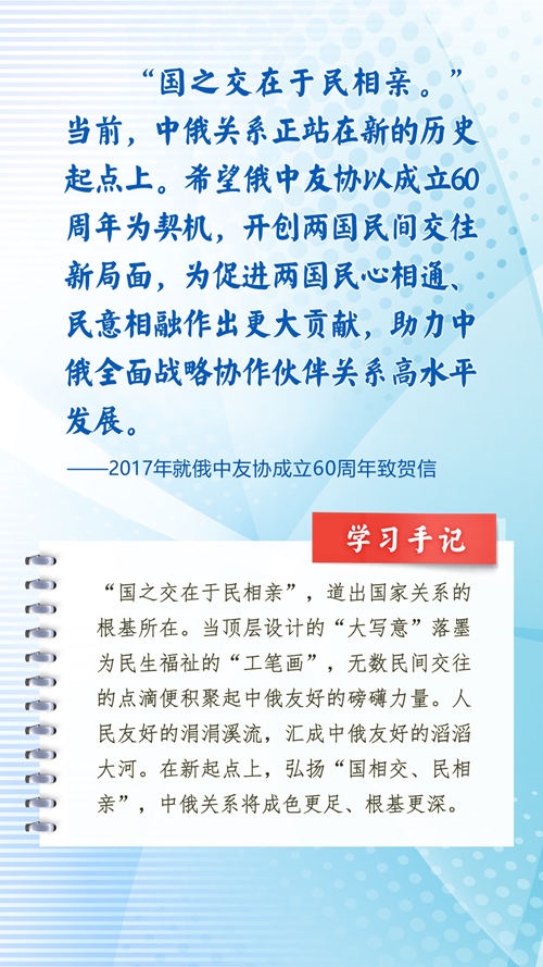 中華民族和俄羅斯民族都有悠久的歷史、古老的文明、燦爛的文化,都是偉大的民族。近年來,習近平主席常常引用中國詩詞古語、俄羅斯諺語名言等,寄語中俄關(guān)系發(fā)展和全人類和平與發(fā)展。這些重要論述,蘊含對文明、歷史的深邃思考,指引著新時代的中俄關(guān)系不斷向前,為世界百年變局中的人類文明進步事業(yè)指明方向。