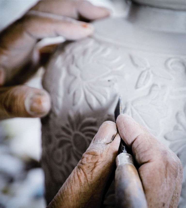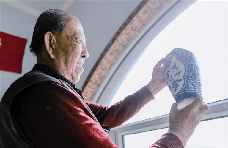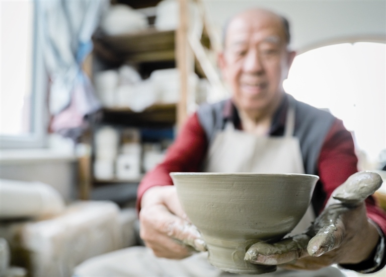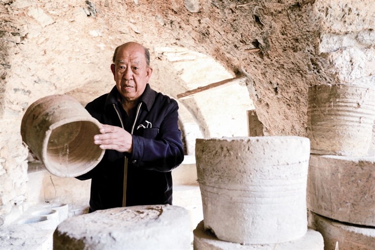 隨后,他走進(jìn)“饅頭窯”旁邊的一口窯洞,這是當(dāng)時(shí)張家的一間手工作坊,揉泥、拉坯、上釉等一系列制作陶瓷的工序都是在這里完成?!拔揖统錾谶@個(gè)村子,已經(jīng)是張家瓷藝的第九代傳人了。作為中國磁州窯譜系,清水河黑礬溝瓷藝生產(chǎn)歷史至少已有800年?!标P(guān)于這項(xiàng)非遺的歷史故事,張選老人向記者娓娓道來:大約400年前,他們張家走西口從山西來到清水河謀生,當(dāng)時(shí)清水河黑礬溝有一家姓杜的人家做陶瓷營生,張家的先人在杜家打工,大概這樣打工做了三輩人吧,杜家忽然不做了,搬離了黑礬溝,他們張家便把杜家的產(chǎn)業(yè)買了下來繼續(xù)做。“那個(gè)時(shí)候黑礬溝生產(chǎn)的瓷器都與人們生活息息相關(guān),比如腌菜缸、水甕、碗盤等,一個(gè)家庭手工作坊一天能生產(chǎn)500個(gè)碗呢,生意很好,人們靠做這個(gè)營生也過上了不錯(cuò)的生活?!睆堖x回憶著清水河瓷藝鼎盛時(shí)期的場(chǎng)景。上個(gè)世紀(jì)70年代,由于交通、技術(shù)等原因,黑礬溝燃燒了幾百年的窯火熄滅,傳統(tǒng)“饅頭窯”被正式廢棄,轉(zhuǎn)移到窯溝鄉(xiāng)后手工作坊變成了機(jī)械化生產(chǎn),這也讓清水河的陶瓷名聲大噪。當(dāng)時(shí),在窯溝鄉(xiāng)一帶,從事陶瓷生產(chǎn)的有近萬人,陶瓷業(yè)成為清水河支柱產(chǎn)業(yè)。