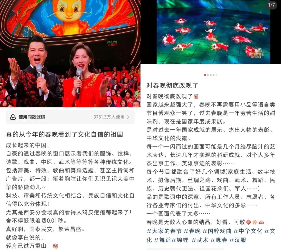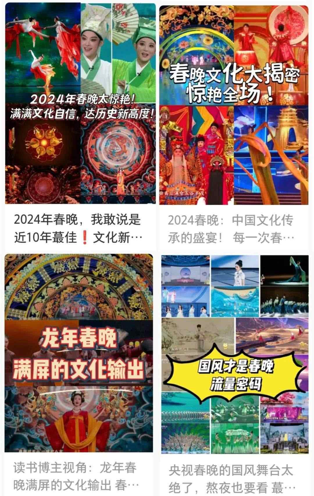 春晚的文化展現(xiàn),在國(guó)人中也引起了熱烈反響。“每一個(gè)文化類節(jié)目都蘊(yùn)含著獨(dú)特的中國(guó)之美,這種美有的跨越千年,有的多經(jīng)磨難,春晚給我們呈現(xiàn)了一場(chǎng)場(chǎng)宏大的視聽(tīng)盛宴,作為觀眾很難不動(dòng)容”“從今年春晚真真切切地感受到了文化自信,大好河山,傳統(tǒng)文化,國(guó)家強(qiáng)盛,美美與共”“文化傳統(tǒng)特色給各個(gè)節(jié)目都刷了創(chuàng)意的漆,霸氣從節(jié)目中升騰,自信從感嘆中生發(fā),真妙”......