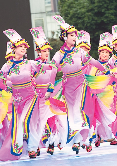 在四川省北川羌族自治縣新生廣場(chǎng),羌族學(xué)生跳沙朗舞歡慶羌?xì)v新年。
